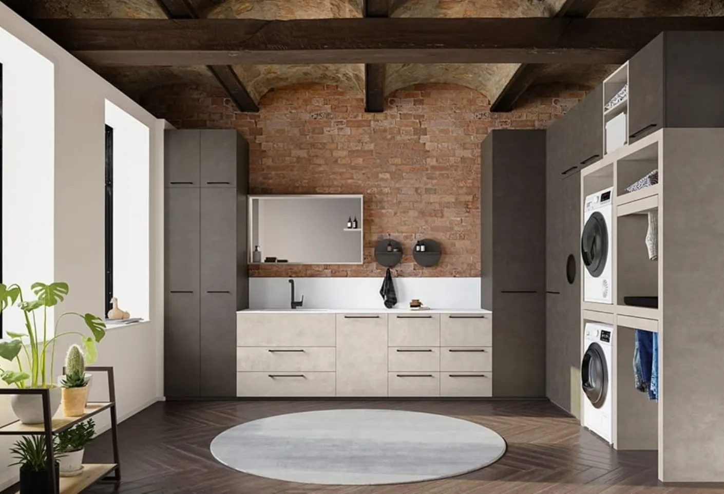 Arreda il bagno di casa moderno ottimamente con Regola 02, mobili bagno per lavanderia e complementi in melaminico di Cerasa.