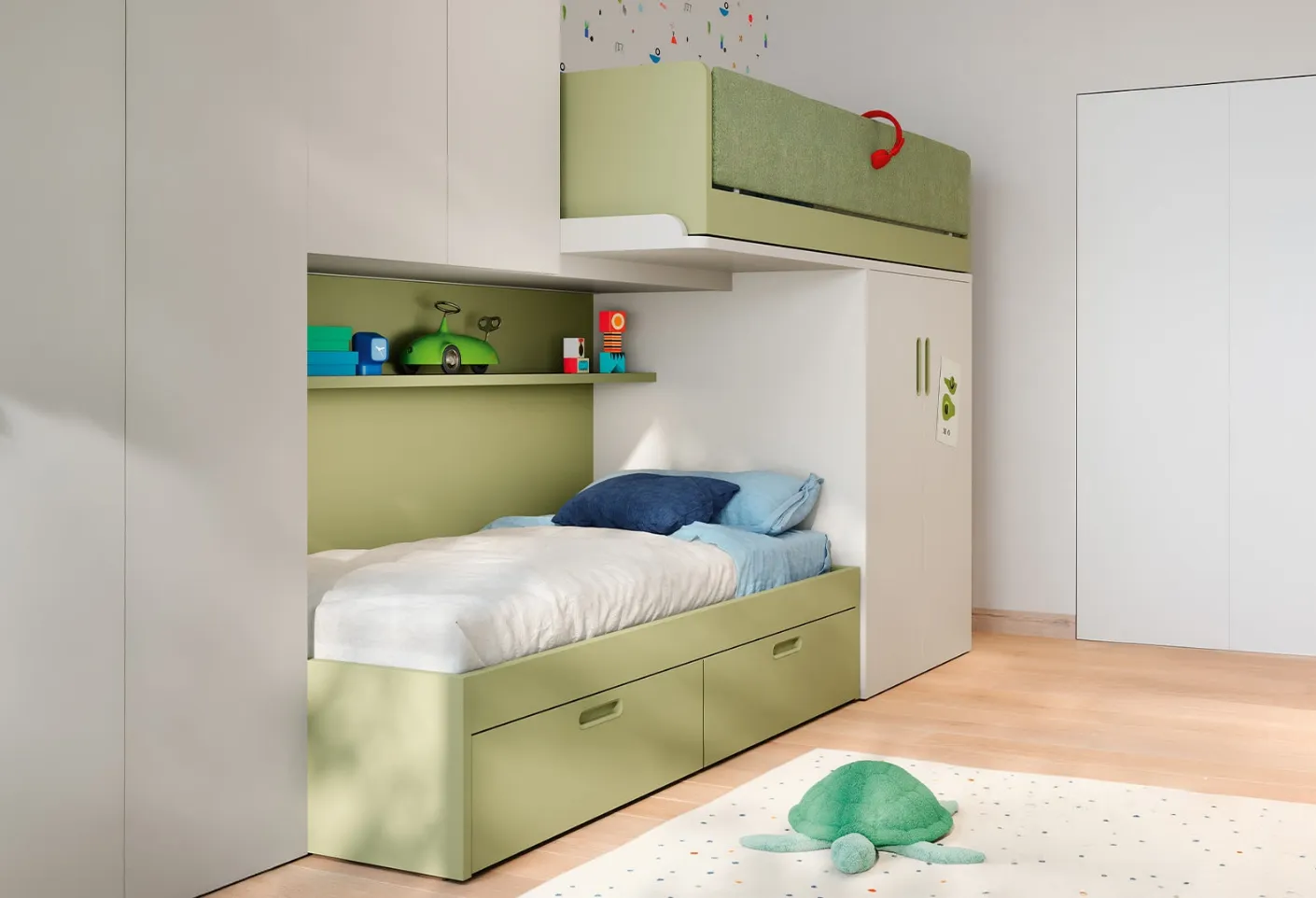 Clicca e scopri di più sulla cameretta per bambini Soppalco Scorrevole Skid! Le Camerette a soppalco Nidi ti attendono.