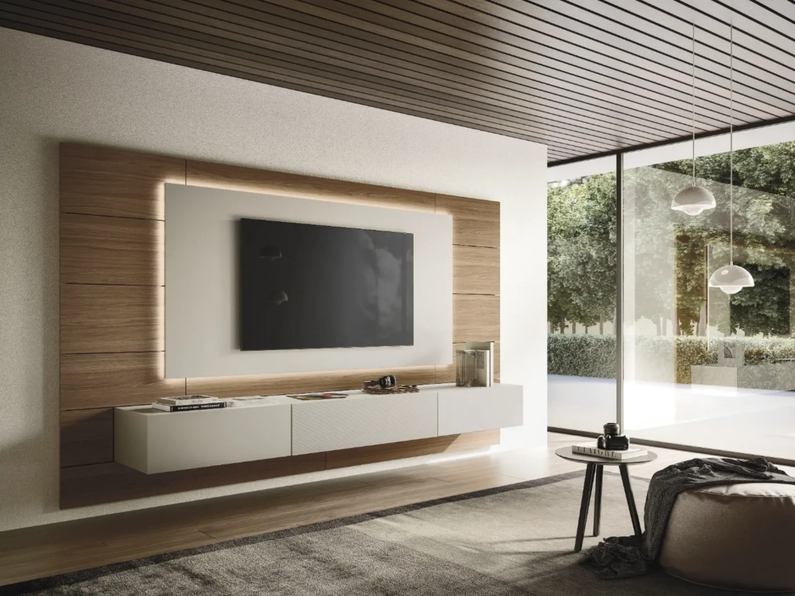 Cerchi un mobile per la TV? Ecco a te il modello Pannello Ciak di Sangiacomo in laccato opaco, pensato per spazi design.
